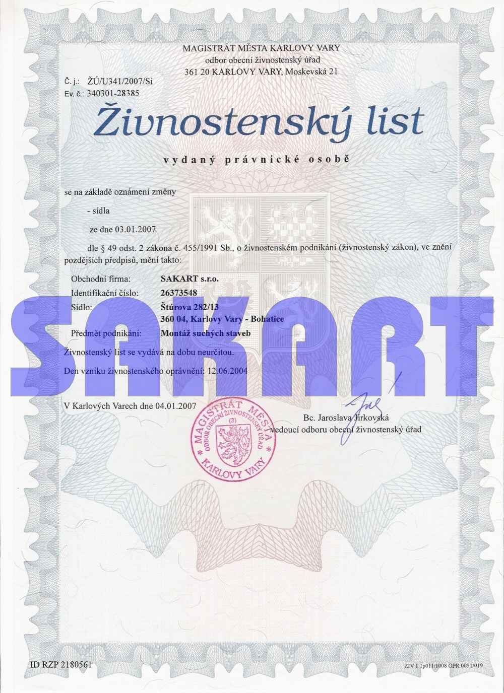 Úvodní stránka » Fotogalerie » Dokumenty firmy » Živnostenský list